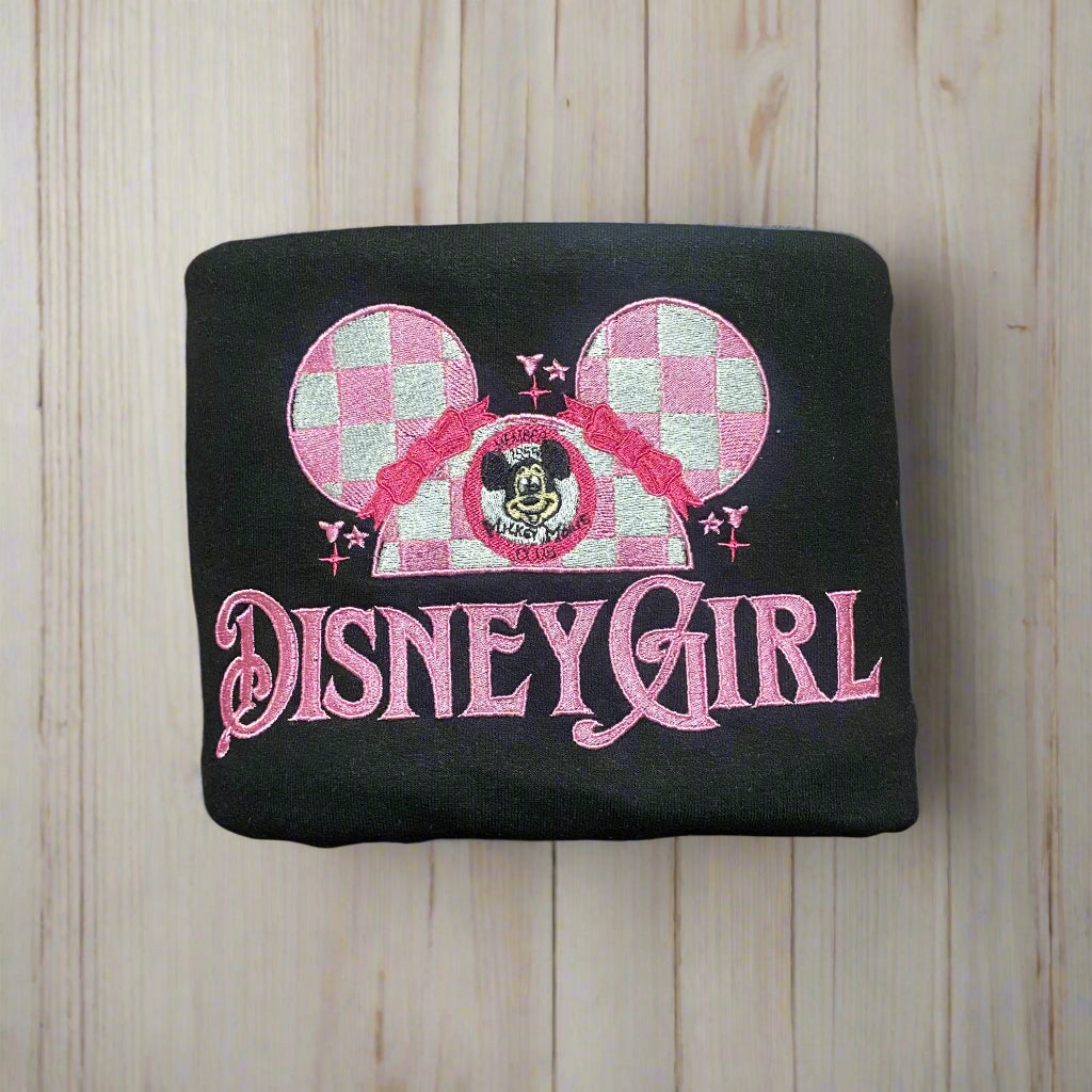 Disney girl with pink checkered ears, you'll be the life of the party at Disneyland and beyond. This is perfect sweatshirt for those chilly nights for a Disney fan (and selfie enthusiast).