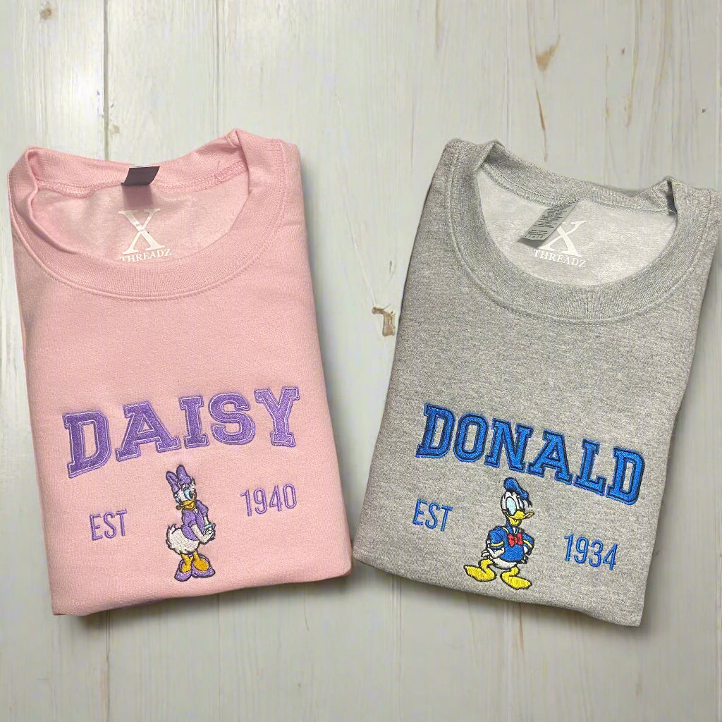 Get ready to quack up with these adorable Daisy and Donald embroidered sweatshirts! Perfect for couples or Disney fans, these sweatshirts are a playful and quirky addition to any wardrobe. Show off your love for these iconic characters with this one-of-a-kind design.